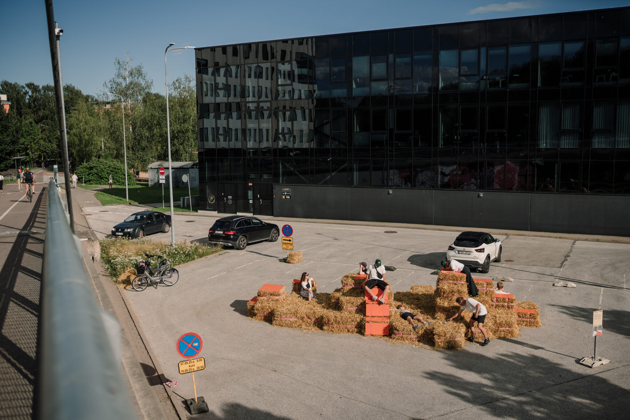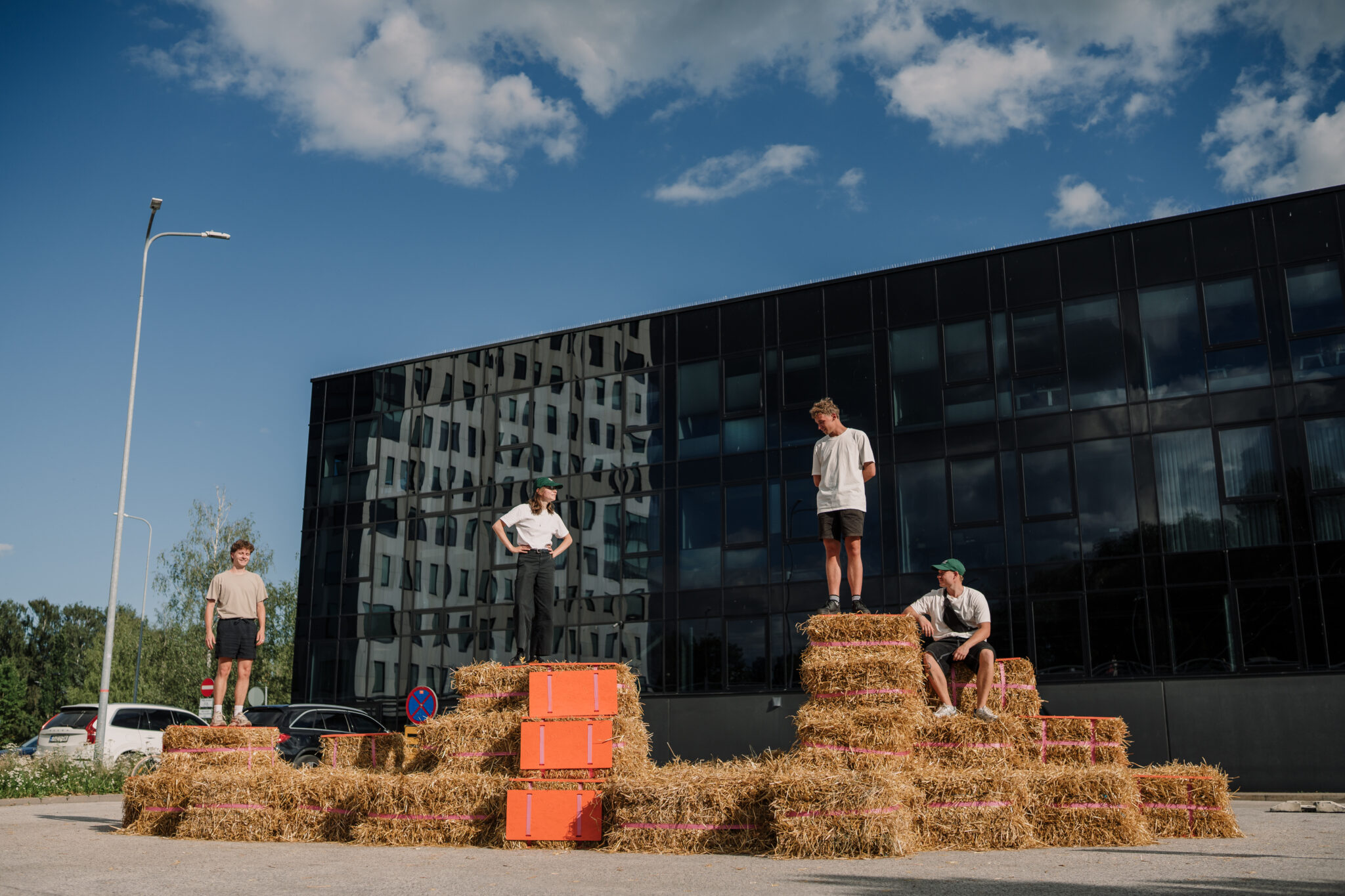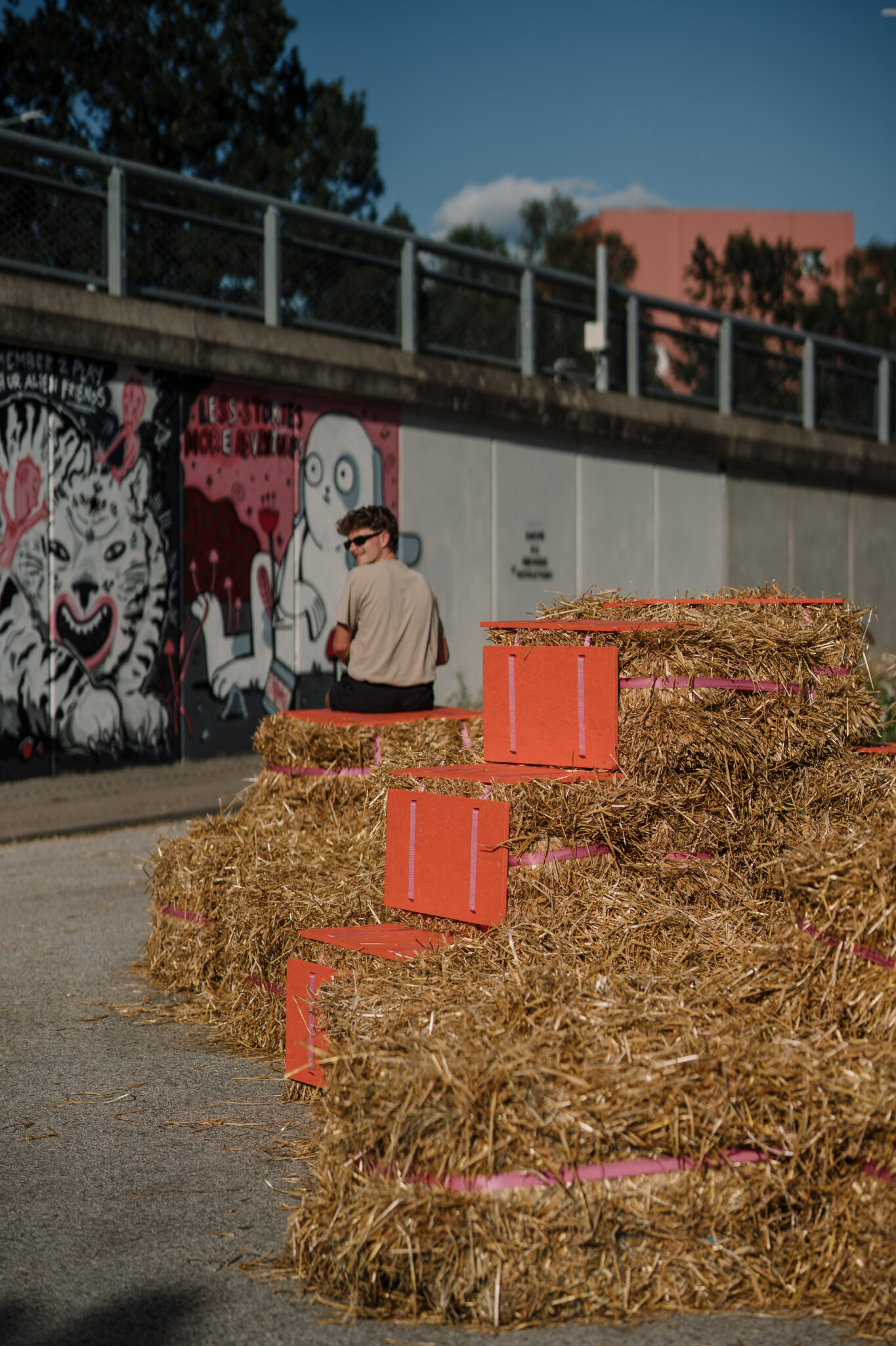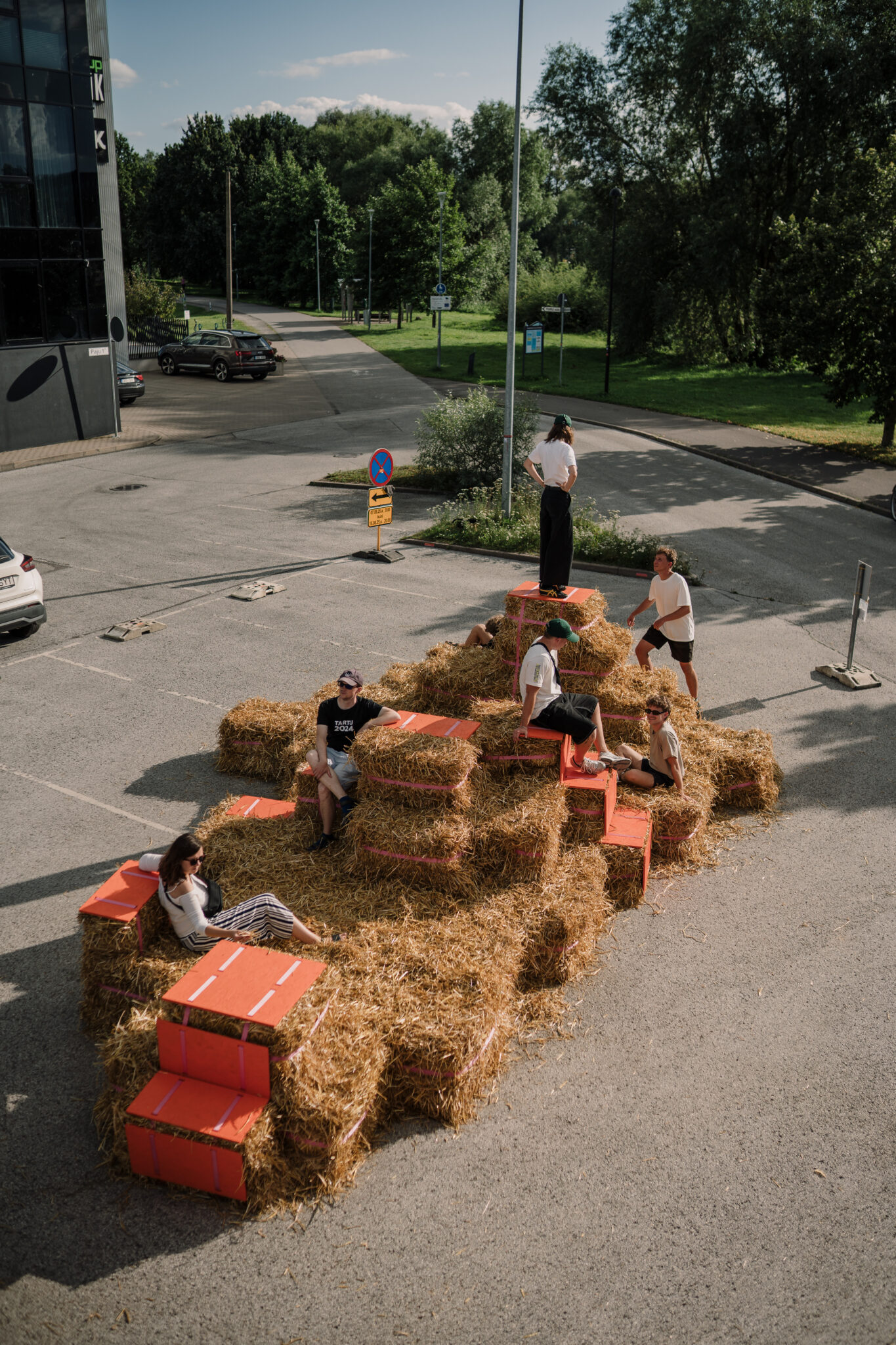 The Floor is lava soft.” intersects the city in the space of a car park – an impermeable slab of of asphalt divided by metal cars with a backdrop of firmly standing buildings. By replacing the typical urban materiality with straw bales, the intervention softens the city landscape, creating a tactile space that is adapted and changed by those using it. This ‘anomaly of softness’ encourages anyone to touch, jump, play, sit, gather or simply just lay around, blurring the borders between the spaces of play and the city itself. Sometimes all it takes is to simply create spaces where play is allowed.
