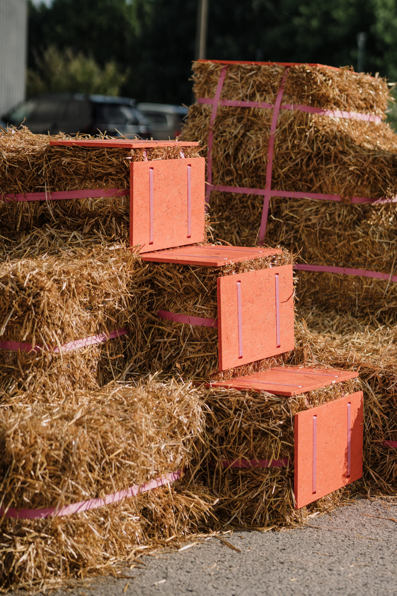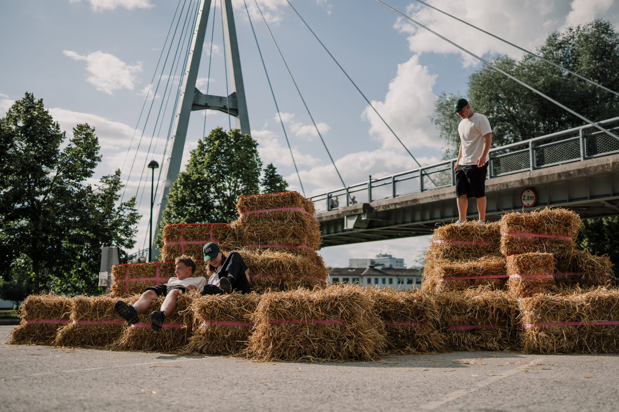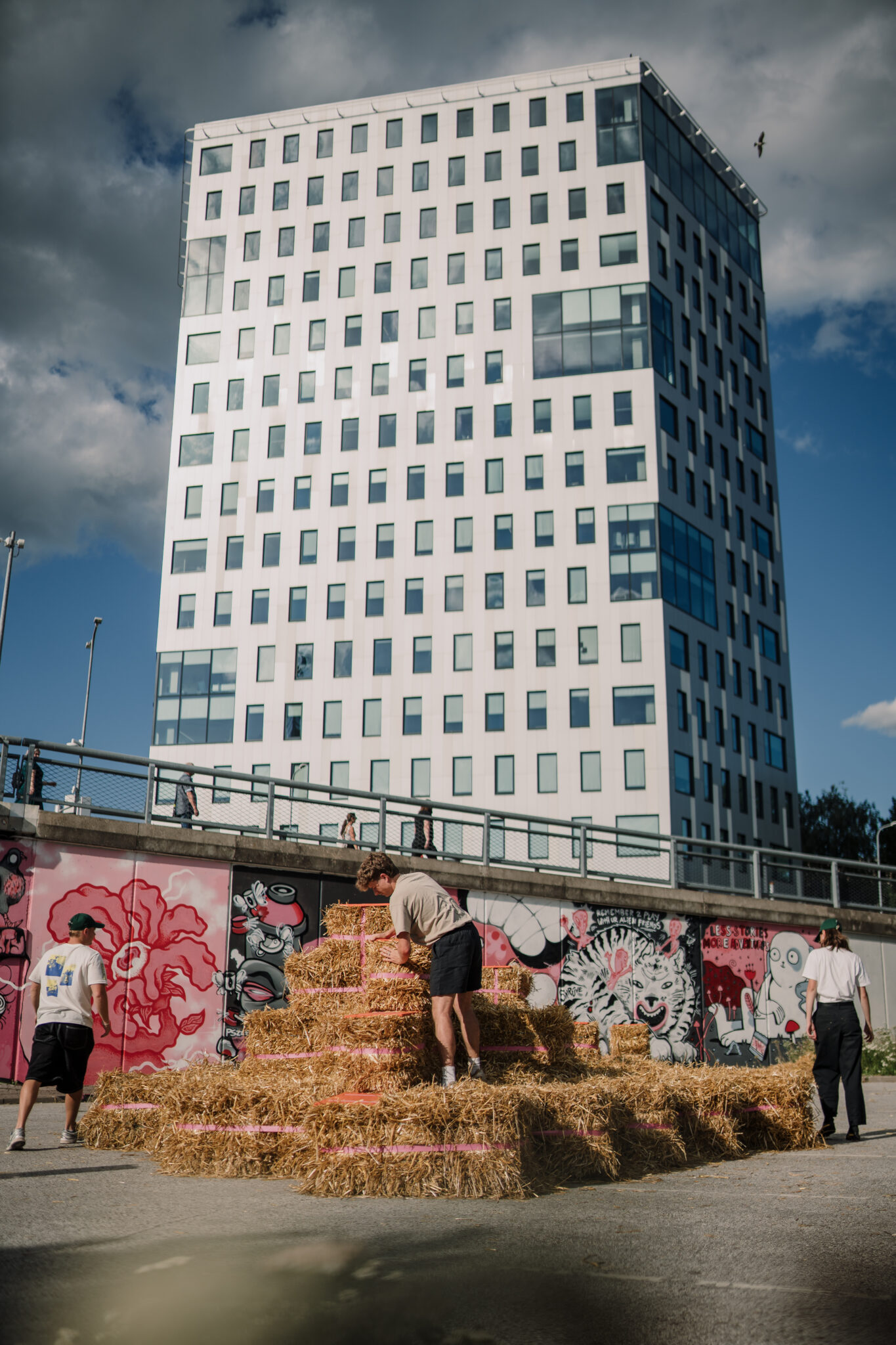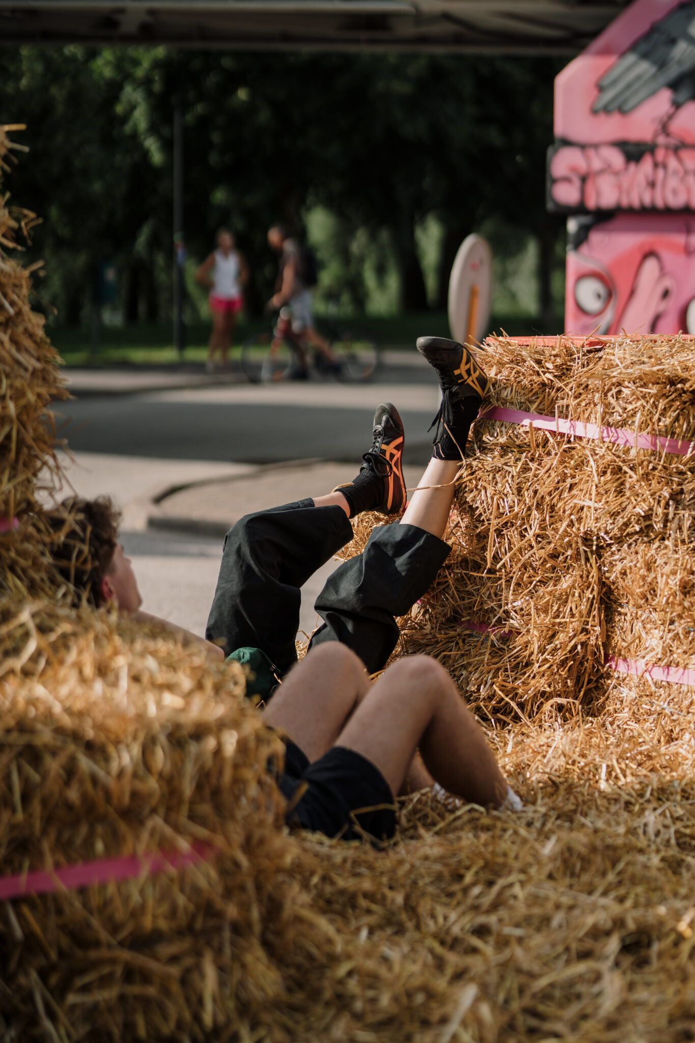 The Floor is lava soft.” intersects the city in the space of a car park – an impermeable slab of of asphalt divided by metal cars with a backdrop of firmly standing buildings. By replacing the typical urban materiality with straw bales, the intervention softens the city landscape, creating a tactile space that is adapted and changed by those using it. This ‘anomaly of softness’ encourages anyone to touch, jump, play, sit, gather or simply just lay around, blurring the borders between the spaces of play and the city itself. Sometimes all it takes is to simply create spaces where play is allowed.