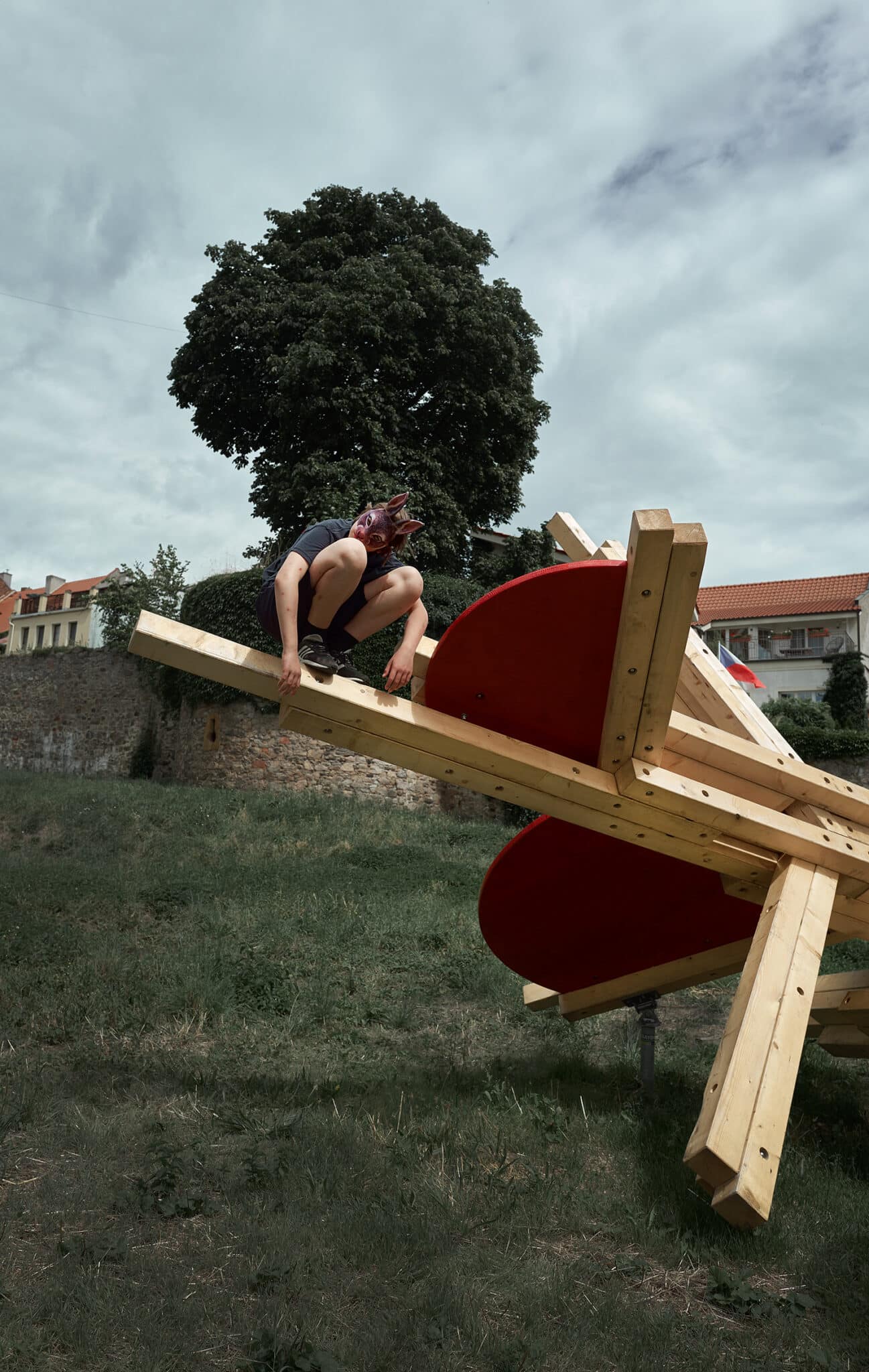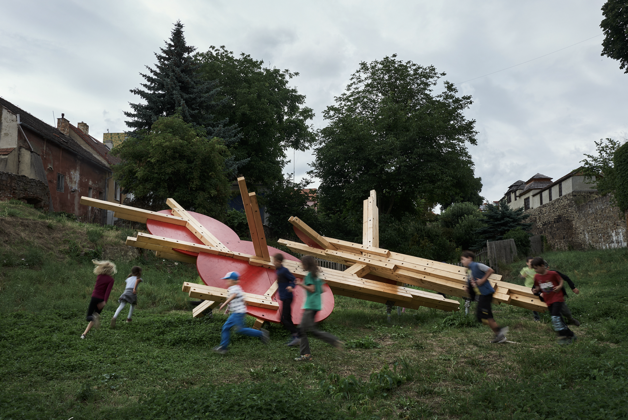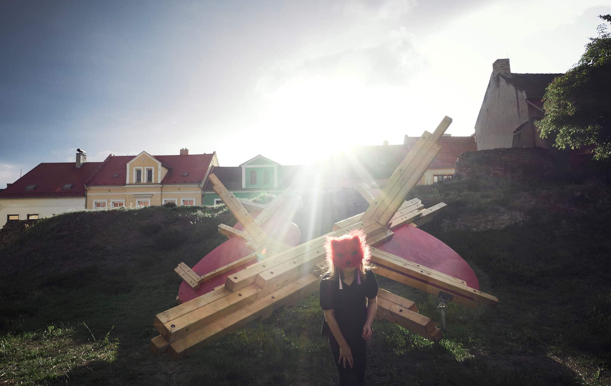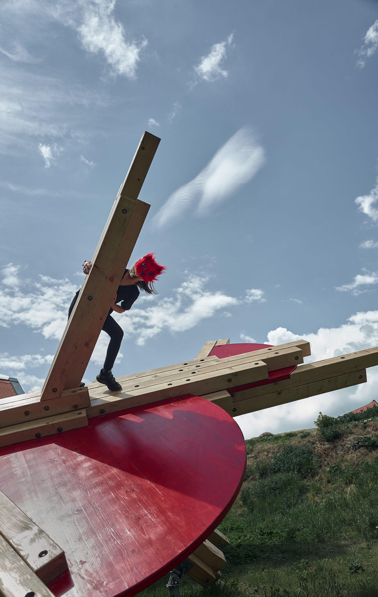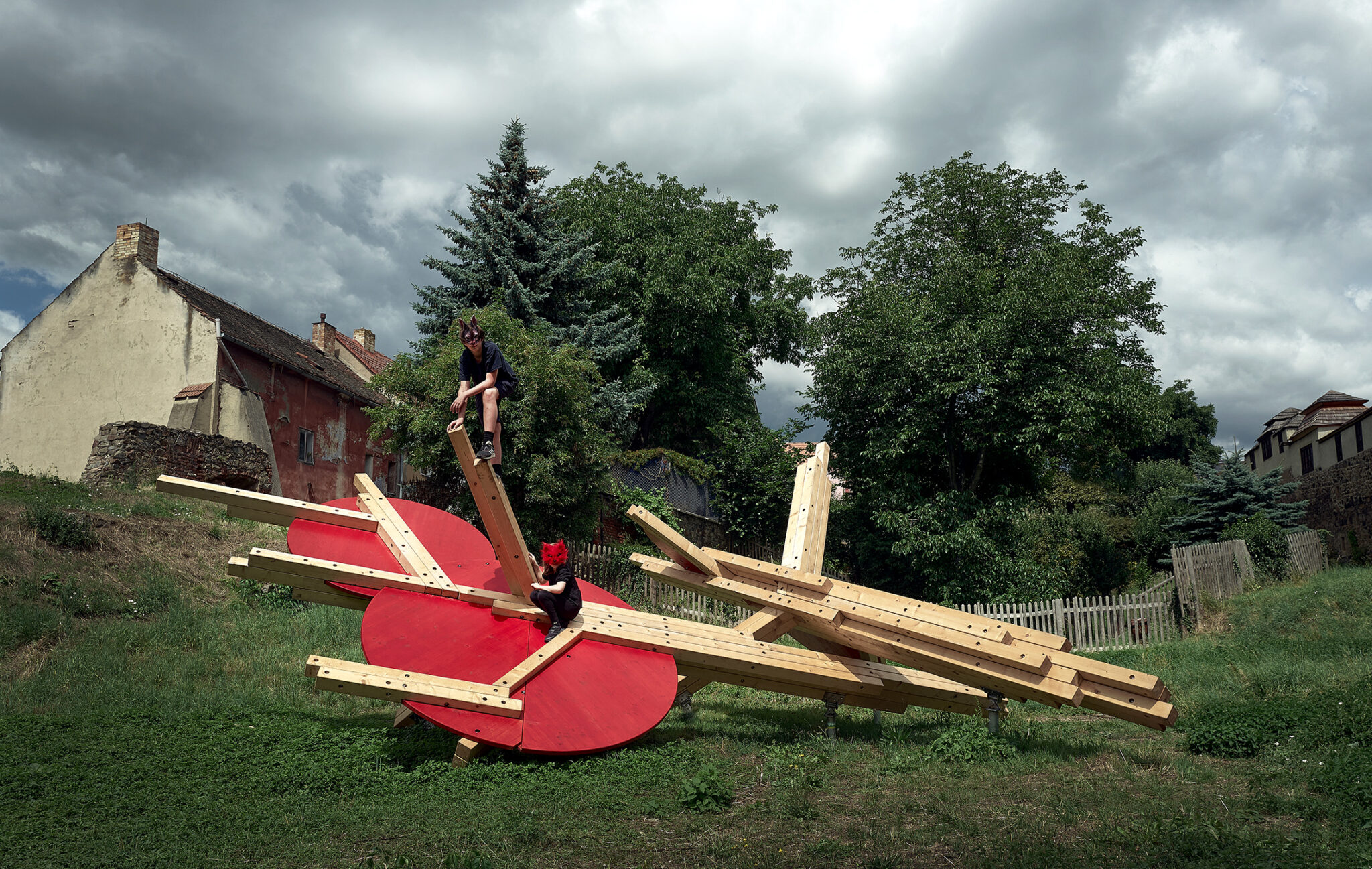 Prior loosely connects observations from neuroscientific disciplines in the practice of designing play installations. The spatial layout is conceived with the targeted intention of stimulating different functions of the human physical and mental apparatus. The combination of optic and haptic sensations in a parallel scenario conveys the visitor, the participant, into an unusual situation. The result of the stimulation is a disruptive reaction, which initiates the organism’s adaptation process. Adaptation is a key mechanism that connects play, learning, and the perception of a work of art. The object is installed in a unique location made accessible for the festival visitors only this year. This autumn commences on the plot construction of a new technology centre designed by Kengo Kuma.