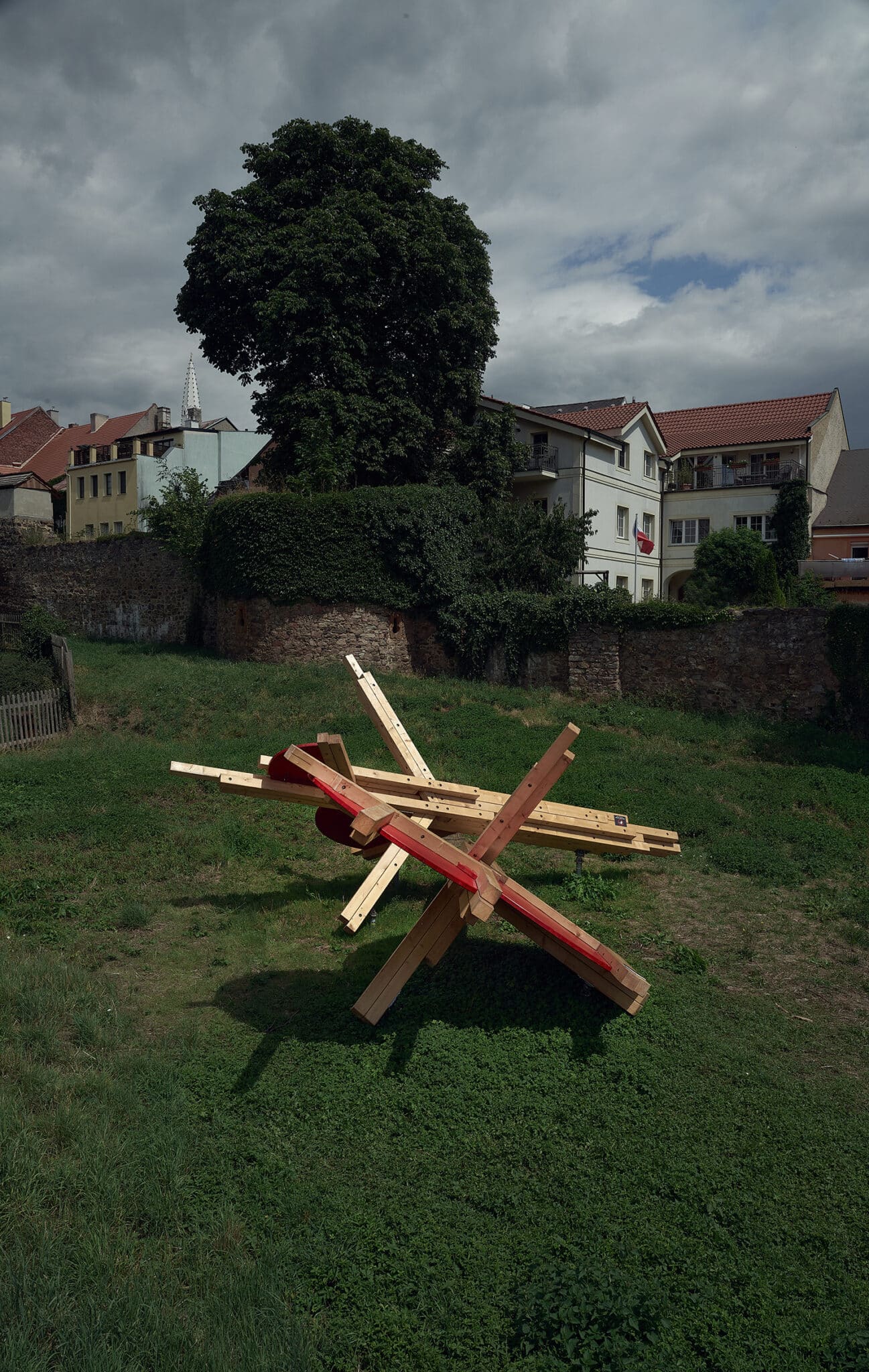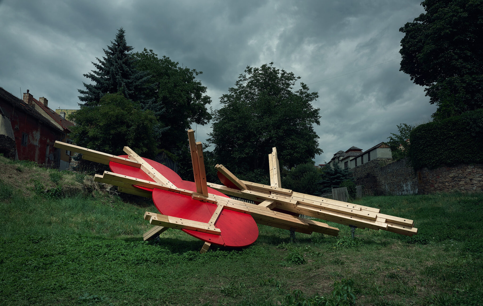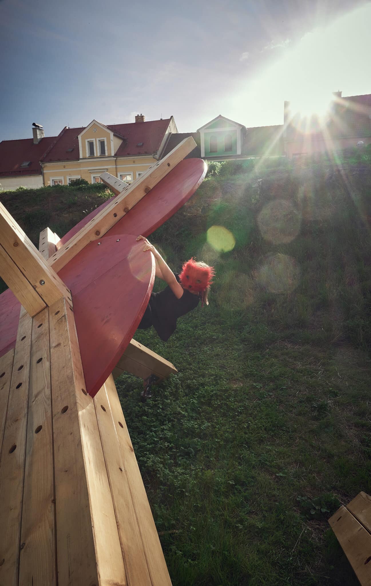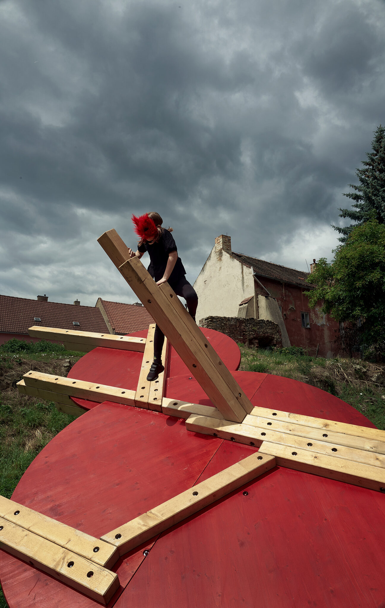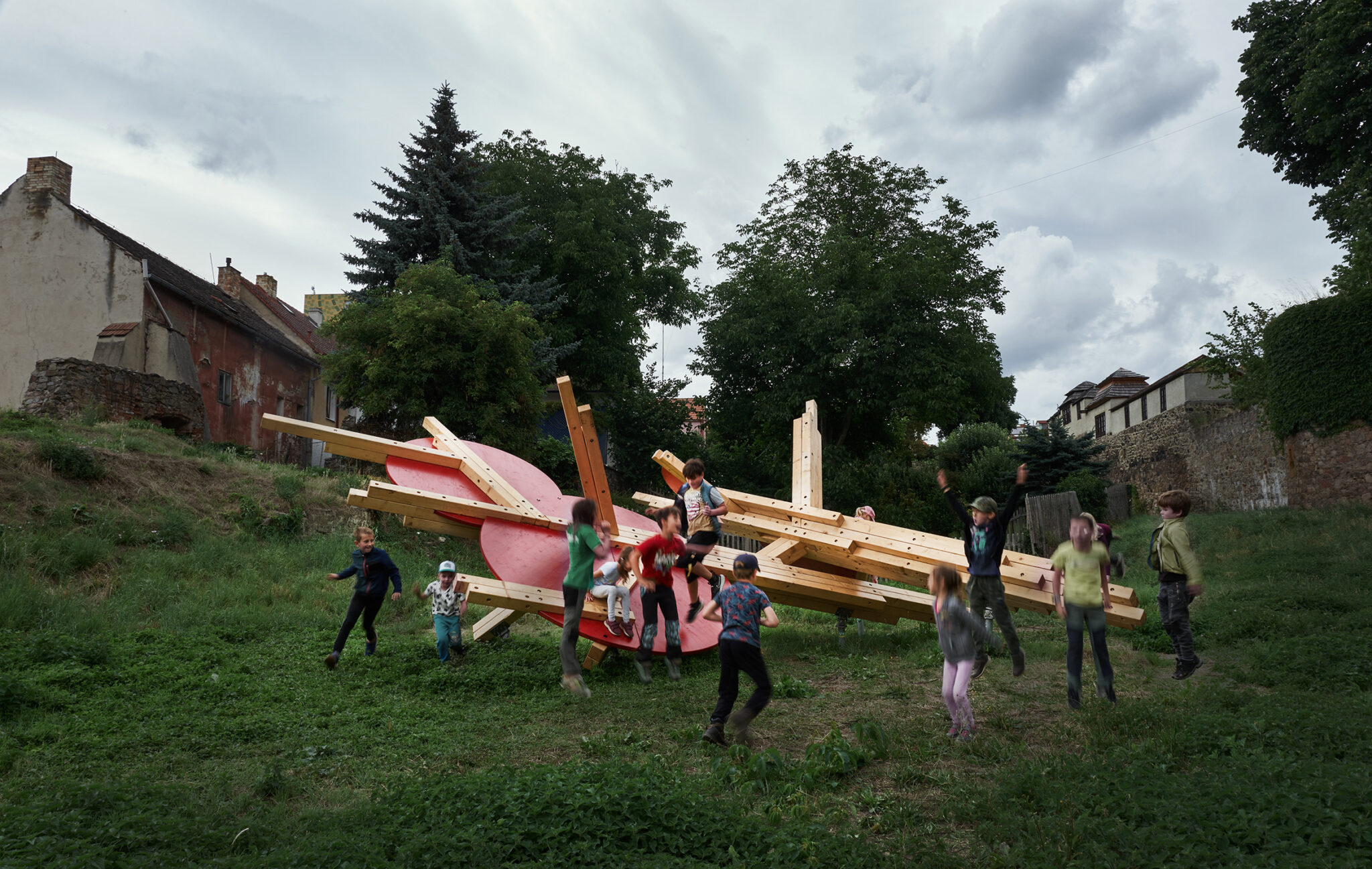 Prior loosely connects observations from neuroscientific disciplines in the practice of designing play installations. The spatial layout is conceived with the targeted intention of stimulating different functions of the human physical and mental apparatus. The combination of optic and haptic sensations in a parallel scenario conveys the visitor, the participant, into an unusual situation. The result of the stimulation is a disruptive reaction, which initiates the organism’s adaptation process. Adaptation is a key mechanism that connects play, learning, and the perception of a work of art. The object is installed in a unique location made accessible for the festival visitors only this year. This autumn commences on the plot construction of a new technology centre designed by Kengo Kuma.