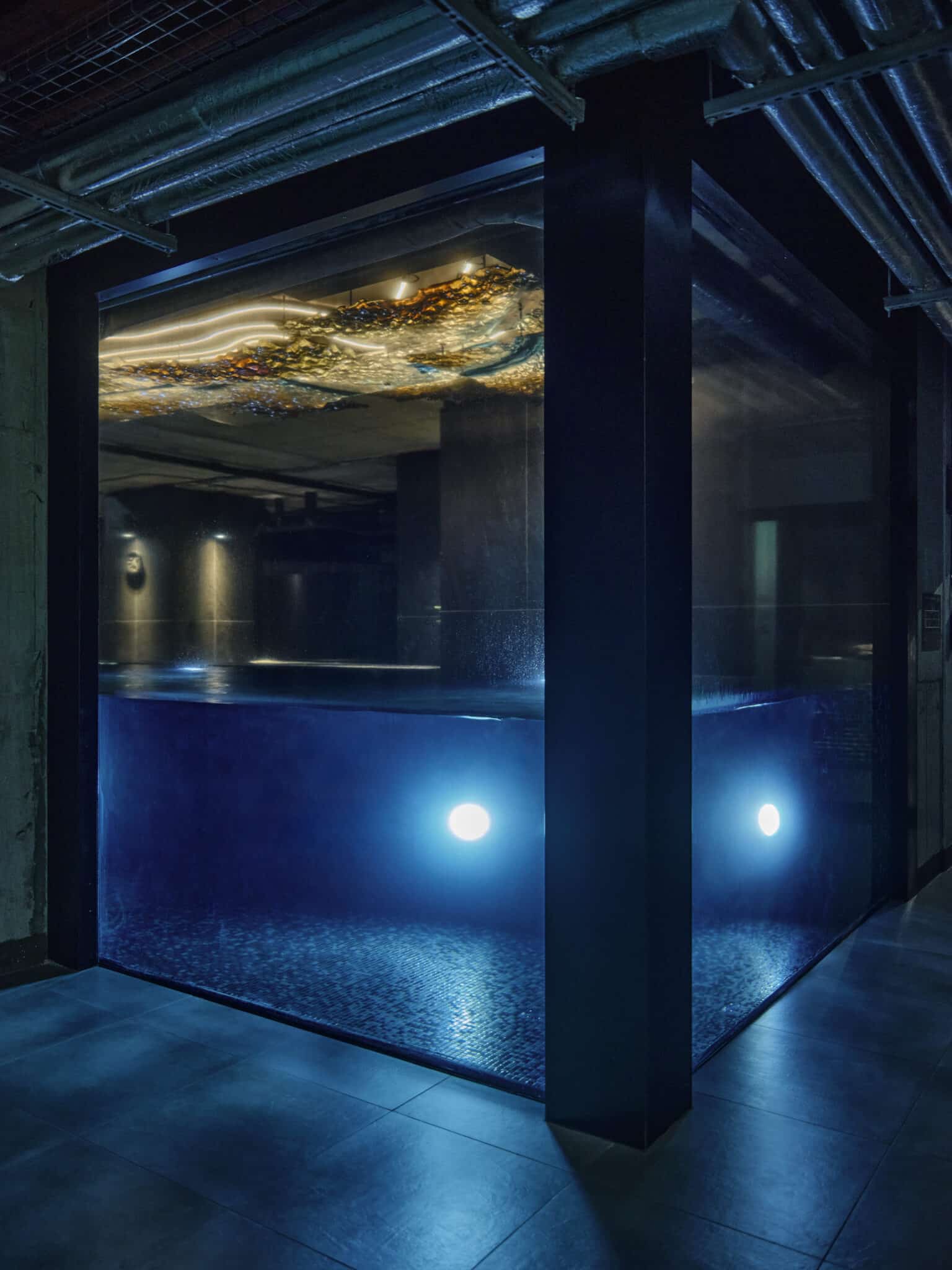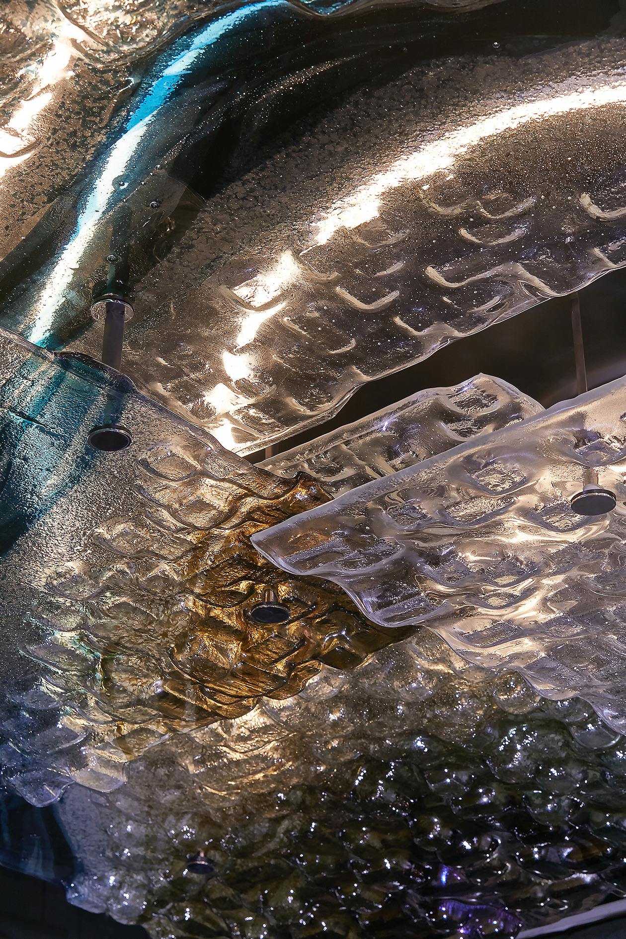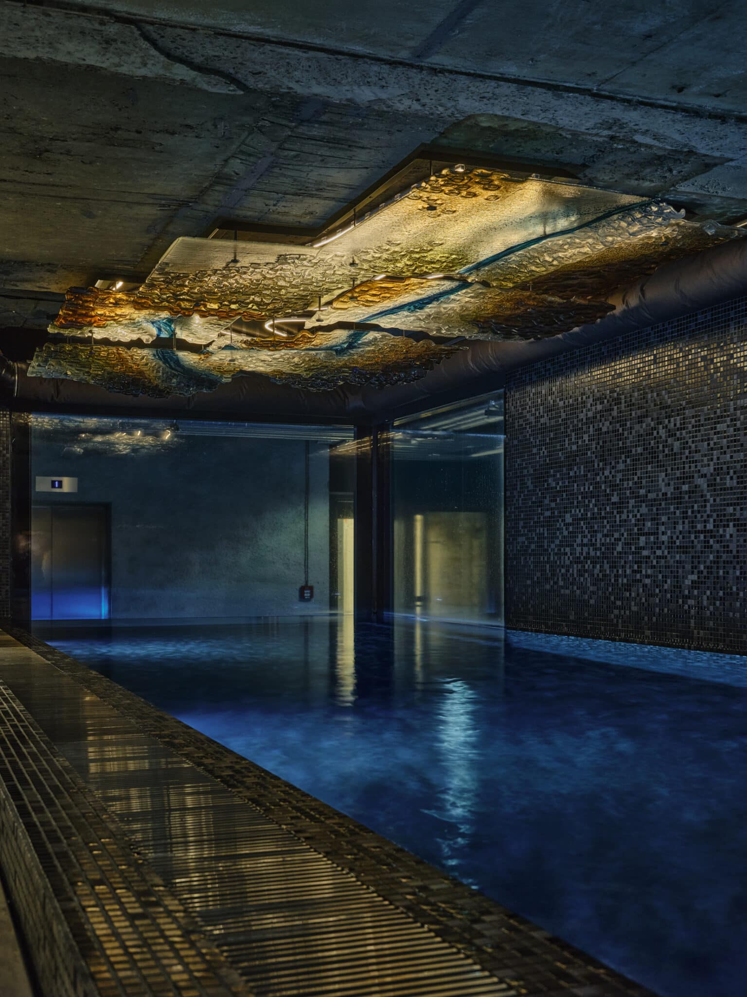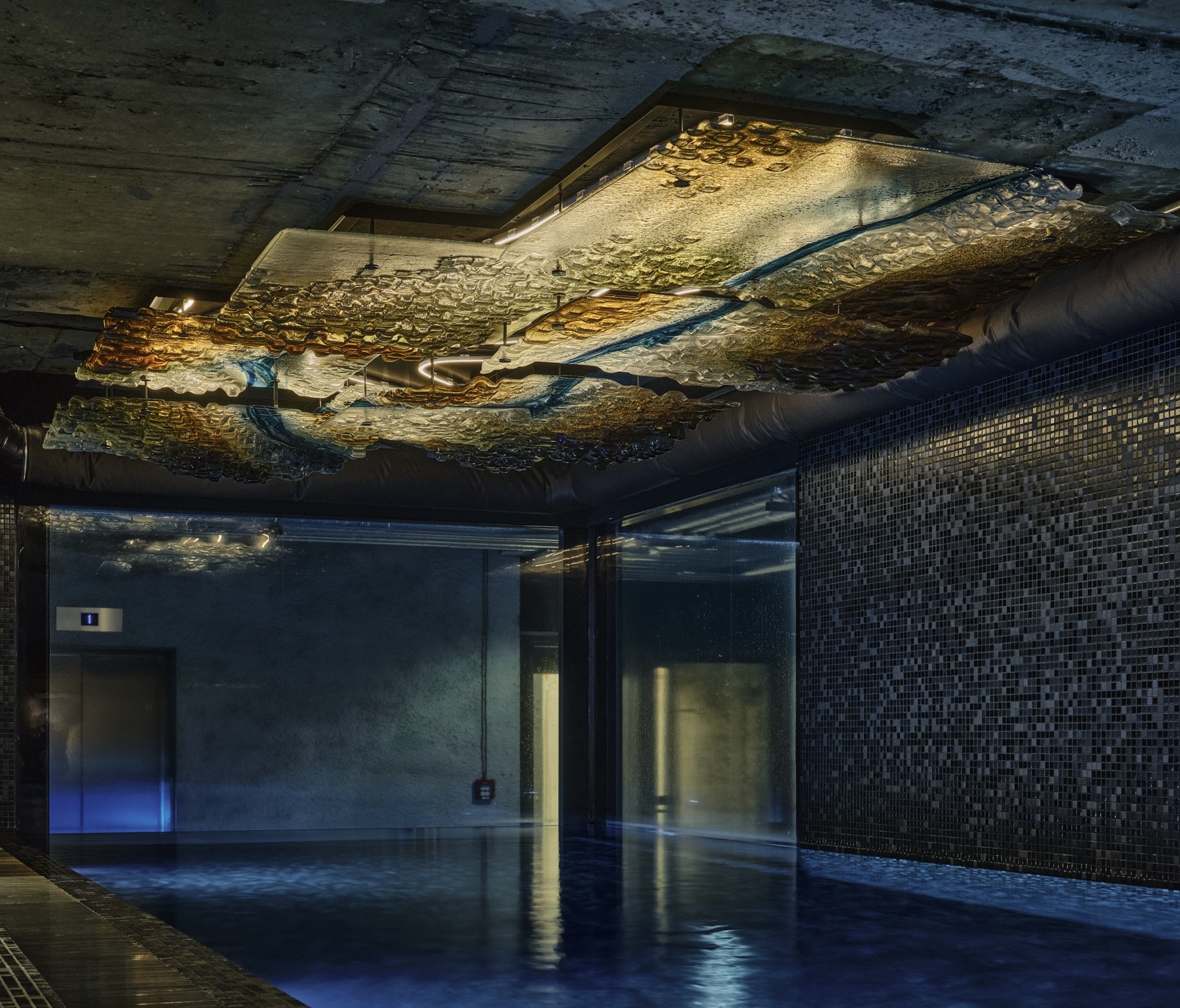 The light sculpture MEANDR – a relief from slumped glass – was created especially for the Vanguard project. The author of the design is sculptor Matěj Hájek, the realization was carried out under the direction of SKULL Studio and in cooperation with the experts from Lasvit Fusing. MEANDR is placed in the ceiling above the water surface of the pool in the underground spa. The subject is the topography of the Vltava riverbed in the area of Vrané nad Vltavou. A landscape situation that is within sight from the highest floors of Vanguard. The work transfers the landscape motif into the interior of the building. It emphasizes the perception of spatial relations, the contrast between imagination and reality.
