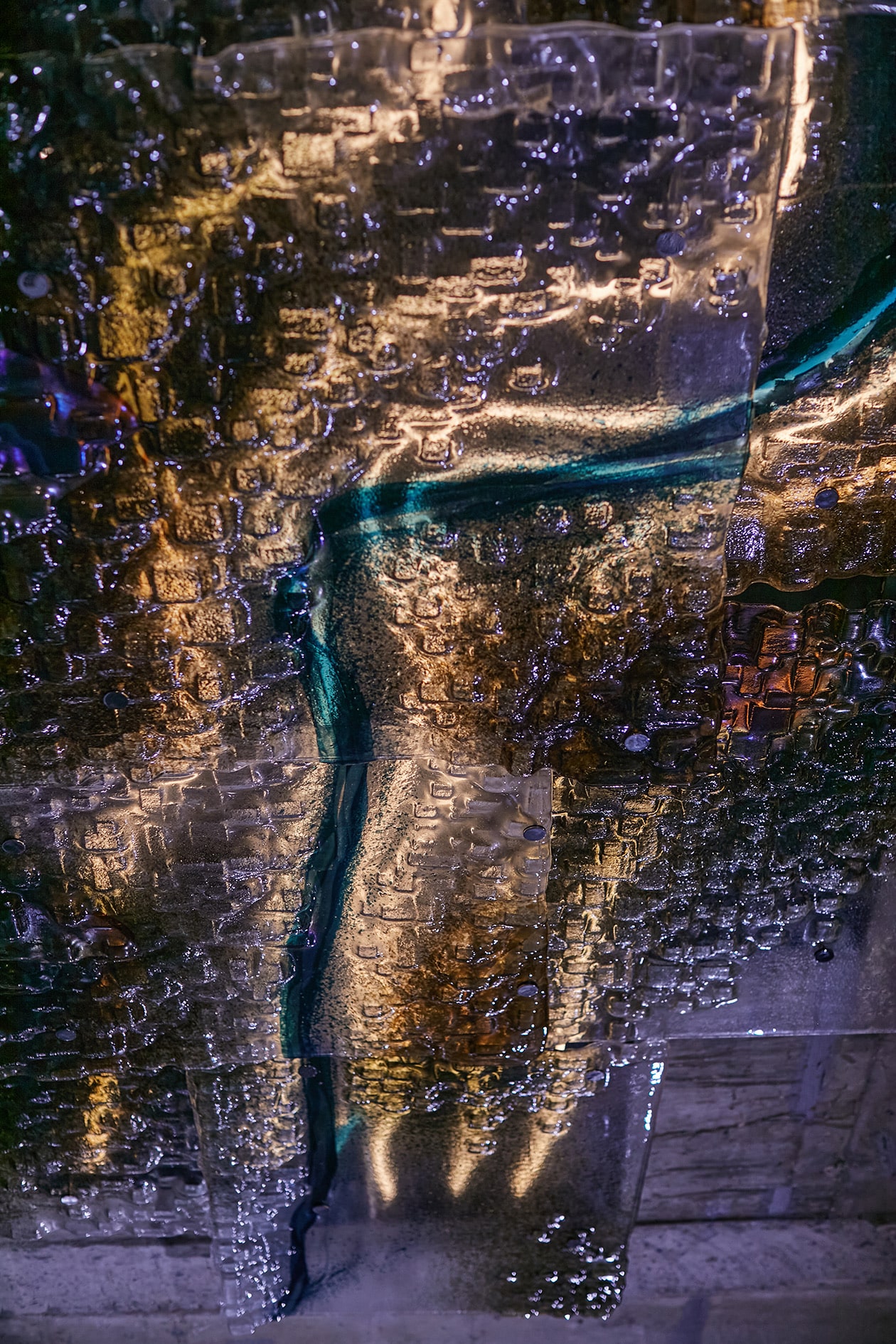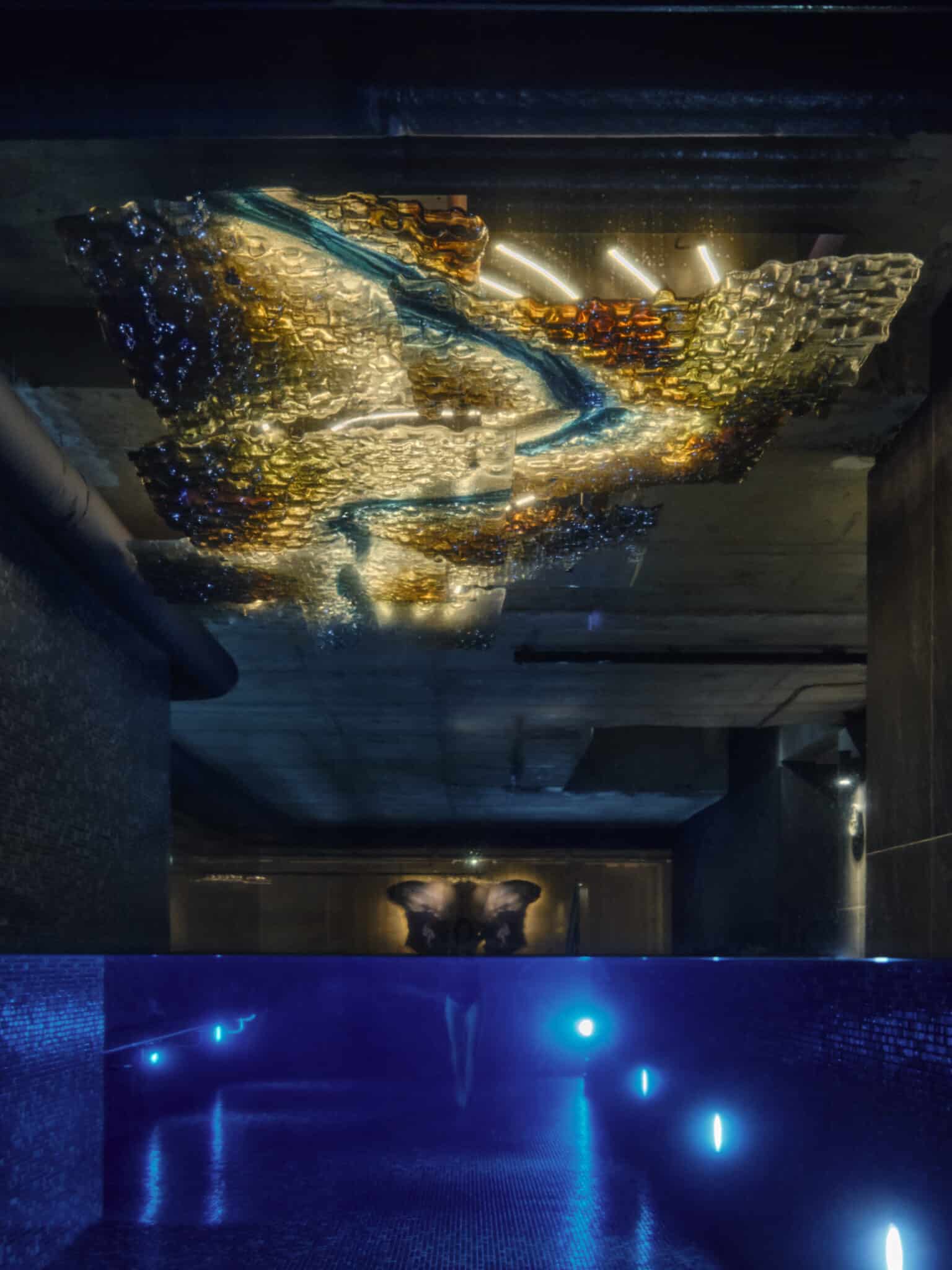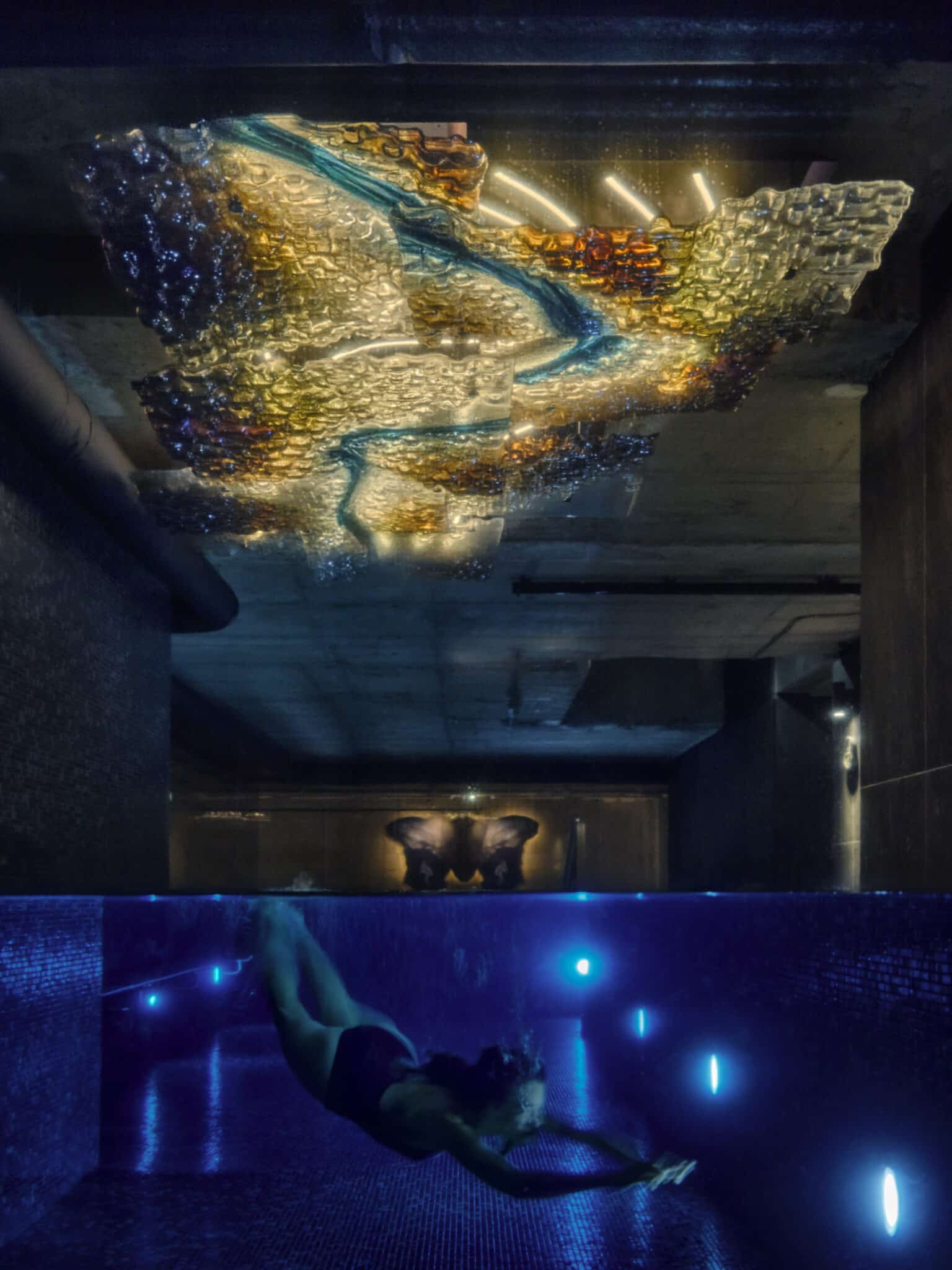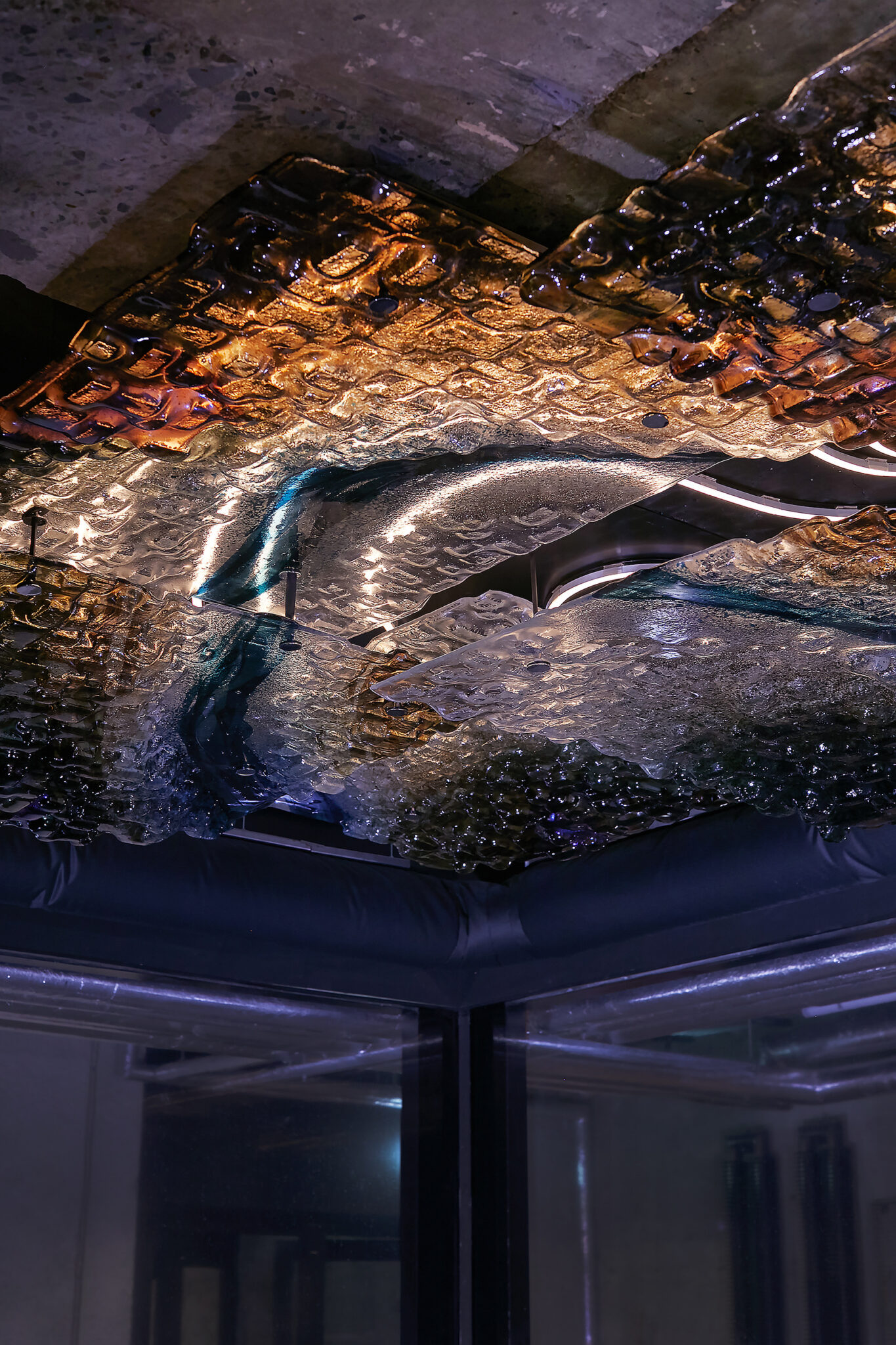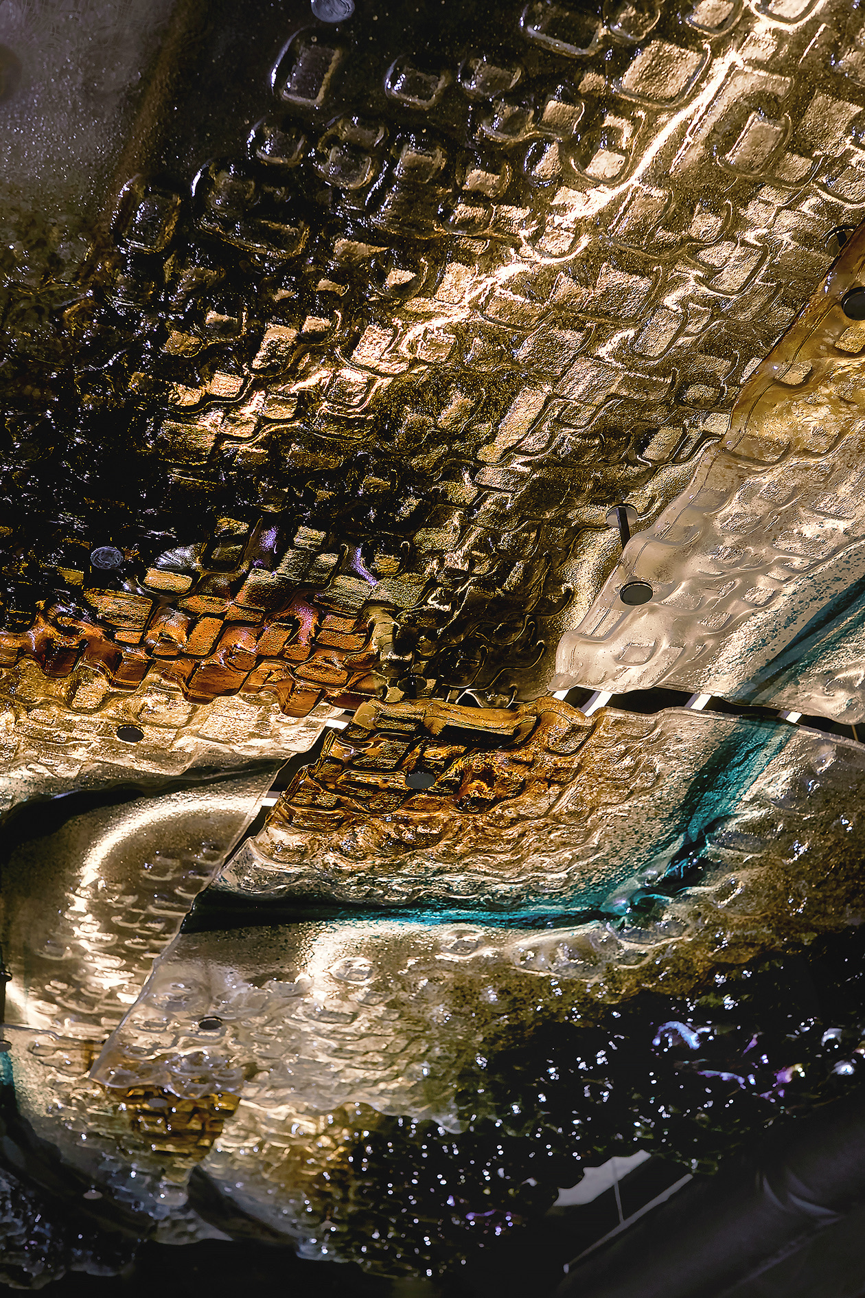 The light sculpture MEANDR – a relief from slumped glass – was created especially for the Vanguard project. The author of the design is sculptor Matěj Hájek, the realization was carried out under the direction of SKULL Studio and in cooperation with the experts from Lasvit Fusing. MEANDR is placed in the ceiling above the water surface of the pool in the underground spa. The subject is the topography of the Vltava riverbed in the area of Vrané nad Vltavou. A landscape situation that is within sight from the highest floors of Vanguard. The work transfers the landscape motif into the interior of the building. It emphasizes the perception of spatial relations, the contrast between imagination and reality.