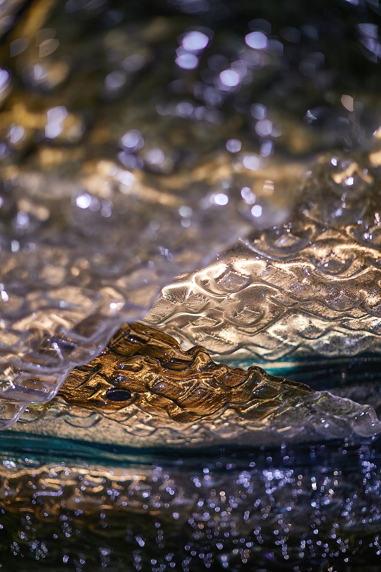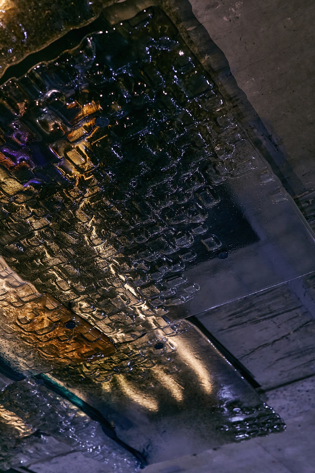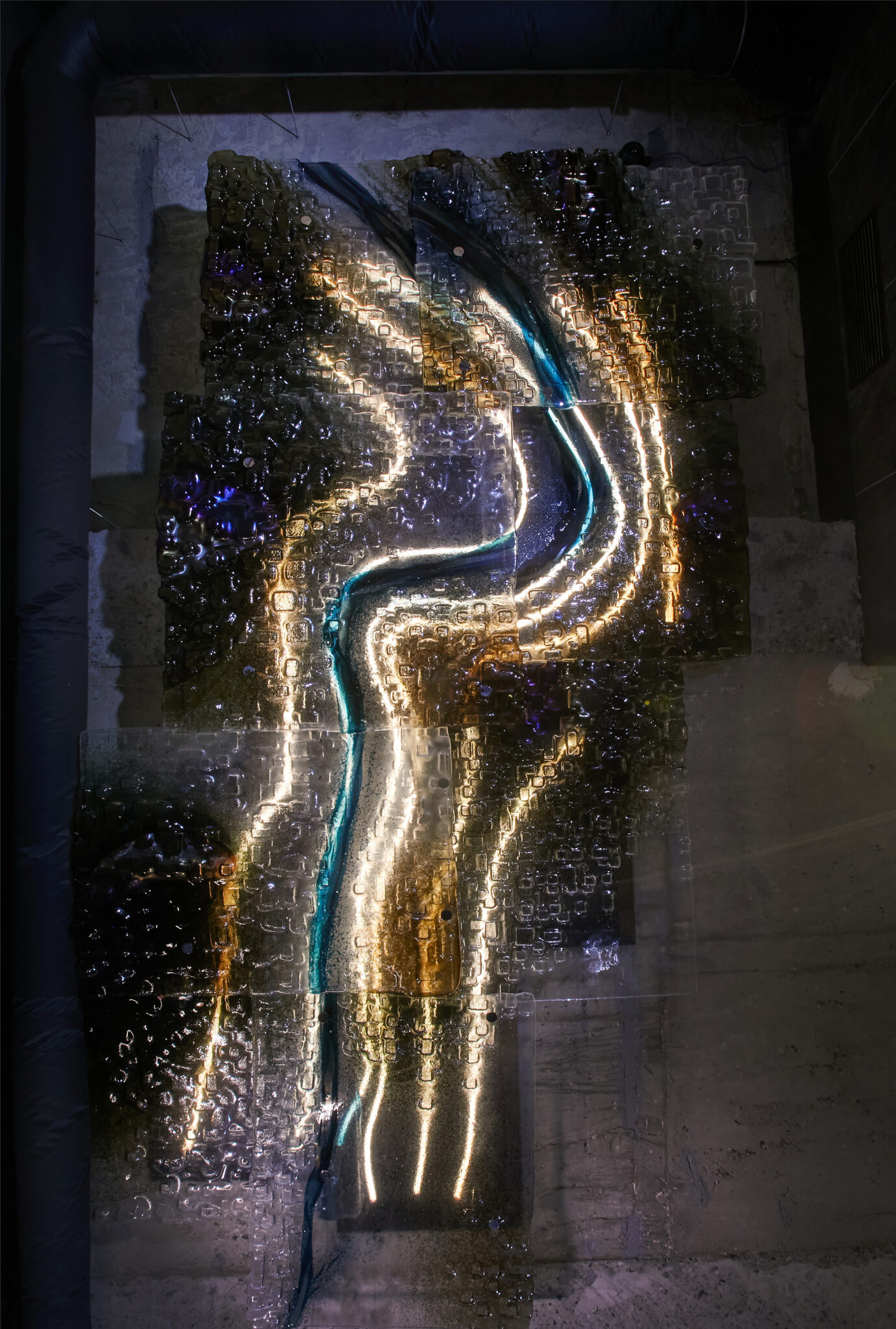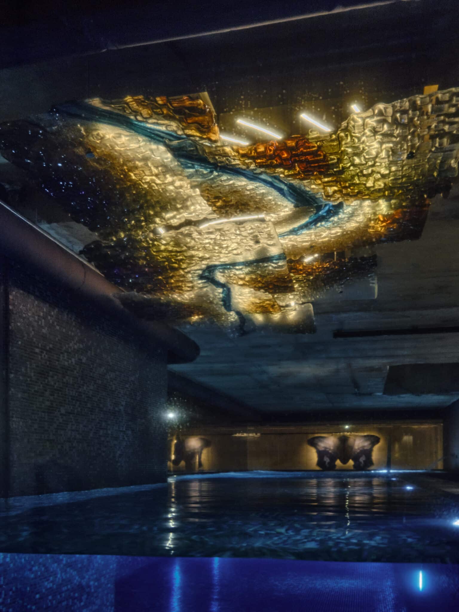 The light sculpture MEANDR – a relief from slumped glass – was created especially for the Vanguard project. The author of the design is sculptor Matěj Hájek, the realization was carried out under the direction of SKULL Studio and in cooperation with the experts from Lasvit Fusing. MEANDR is placed in the ceiling above the water surface of the pool in the underground spa. The subject is the topography of the Vltava riverbed in the area of Vrané nad Vltavou. A landscape situation that is within sight from the highest floors of Vanguard. The work transfers the landscape motif into the interior of the building. It emphasizes the perception of spatial relations, the contrast between imagination and reality.